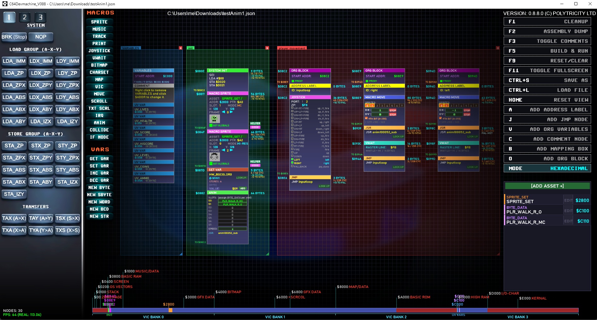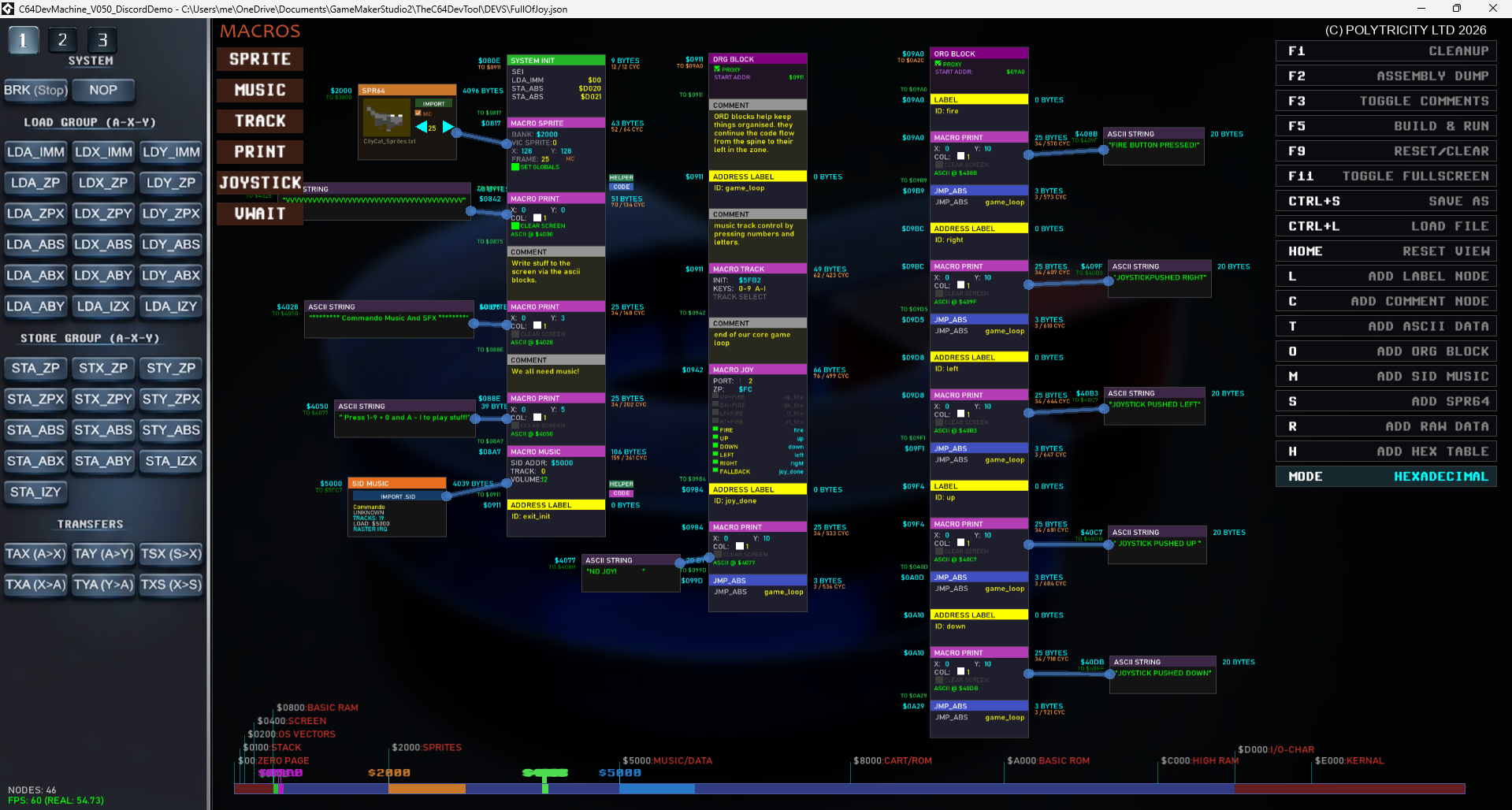 Thanks Arlasoft for the suggestions, they will be useful as this grows. I have comment nodes that will be good to give that kind of teaching side and I will make up a series of files for that at some stage too, as well as make a game with it. In most cases it is as close to coding in assembly as you could get but node based. The macros themselves could contain those things like Hud (with font asset, number of characters for score, Position etc) then the address it would fetch the data from and so on... It's forever evolving and I am in free-fall just trusting the process hoping things will click into place.