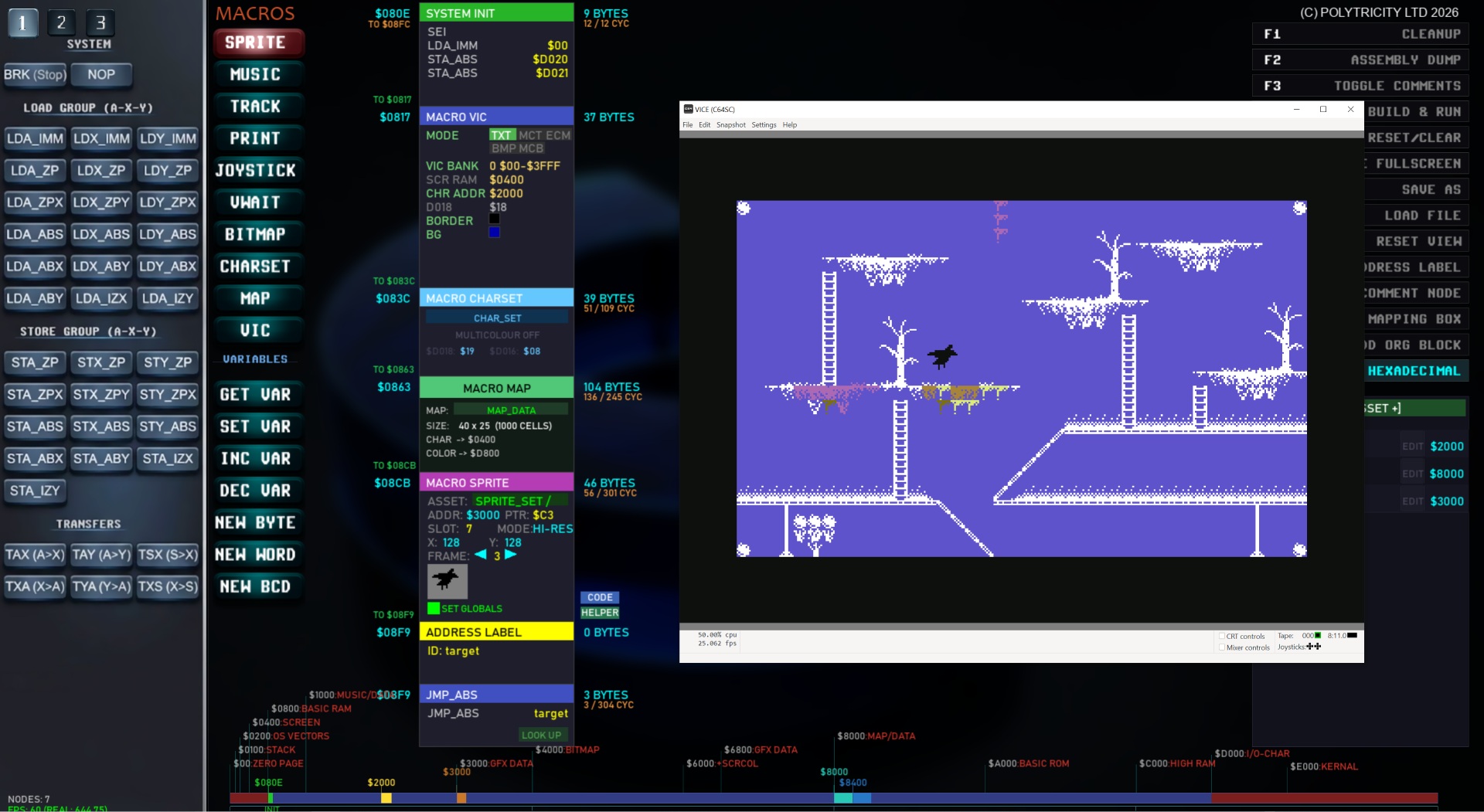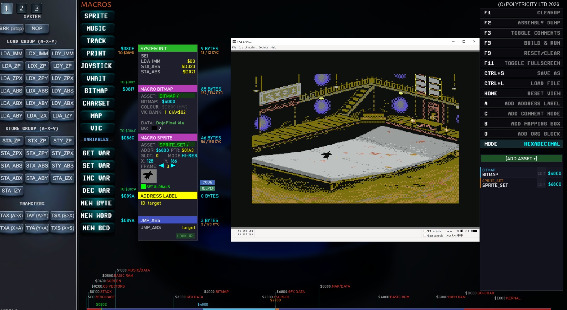 Looks interesting. At first glance my main suggestion for an improvement would be to have tabs at the top so different modules (e.g. player, enemy, IRQ, Hud, GameOver) can be kept separate rather than a huge scrolling area. Perhaps with a separate panel that allows access to labels defined in other modules.